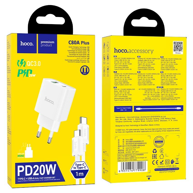 Сетевое зарядное устройство c USB + Type-C HOCO C80A Plus, кабель Type-c + Type-c, QC 3.0, PD 20W, белое информация: