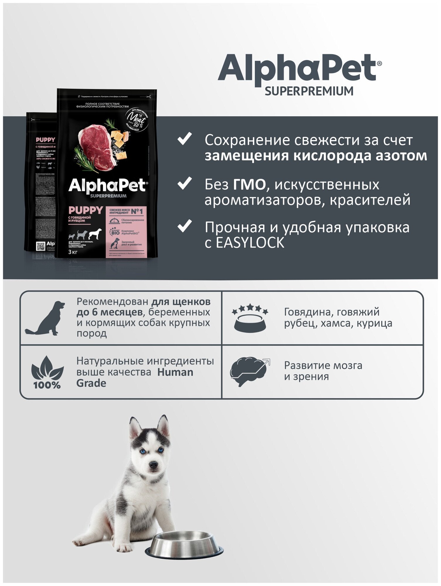 10 цен на Сухой корм AlphaPet для щенков крупных пород до 6 месяцев с говядиной и рубцом 3 кг