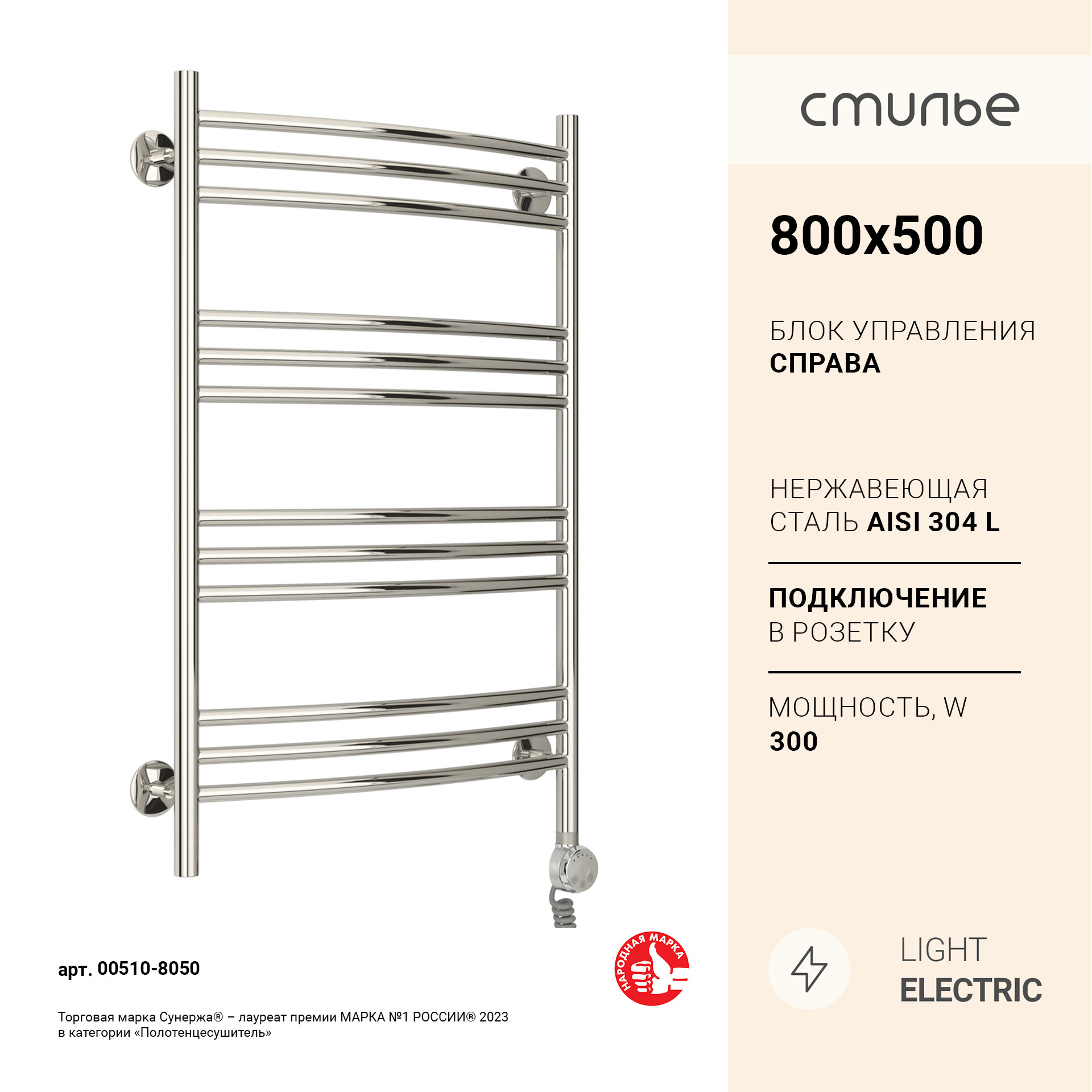 Полотенцесушитель электрический Стилье Формат-10, 800х500, ТЭН справа 00510-8050 17 250 ₽