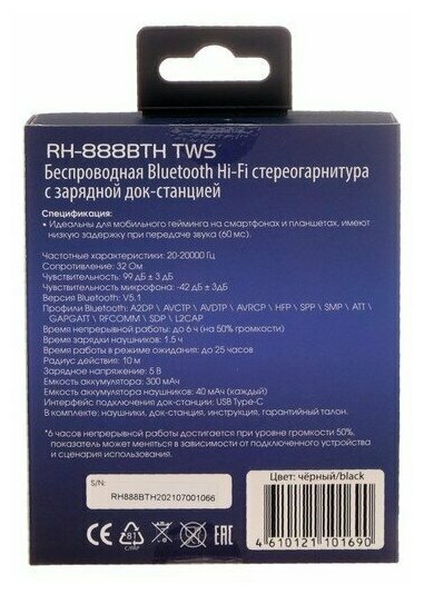Наушники Ritmix RH-888BTH, беспроводные, вакуумные, игровые, микрофон, BT5.1, 300мАч, черные (1 шт.) информация: