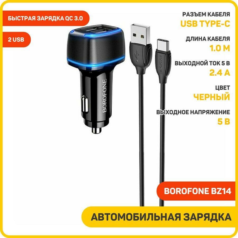 Автомобильное зарядное устройство (АЗУ) Borofone BZ14 (2 USB) + кабель Type-C, 2.4 А, черный информация: