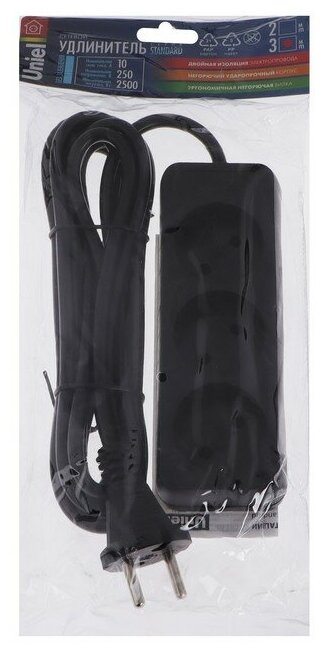 Uniel Удлинитель Uniel Standart, 3 розетки, 3 м, 10 А, 2500 Вт, без з/к, черный