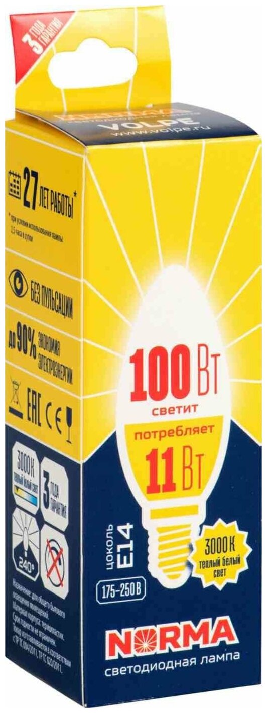 Светодиодная лампа VOLPE LED-C37-11W/WW/E14/FR/NR картон информация: