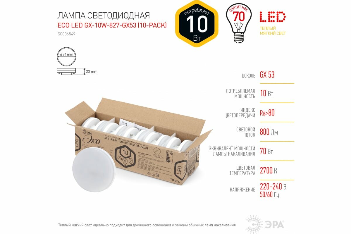 ЭРА ECO LED GX10W827GX53 10PACK диод, таблетка, 10Вт, тепл, GX53 Б0036549 . информация: