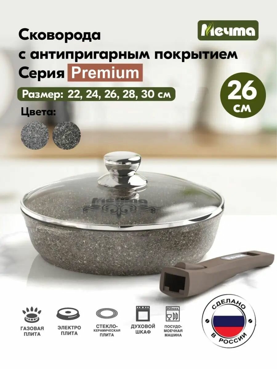 Сковорода "Мечта" 26см Премиум с антипригарным покрытием со съемной ручкой и крышкой, можно мыть в посудомоечной машине информация: