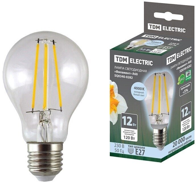 10 цен на TDM SQ0340-0282 Лампа светодиодная "Филамент" А60-12 Вт-230 В-4000 К–Е27