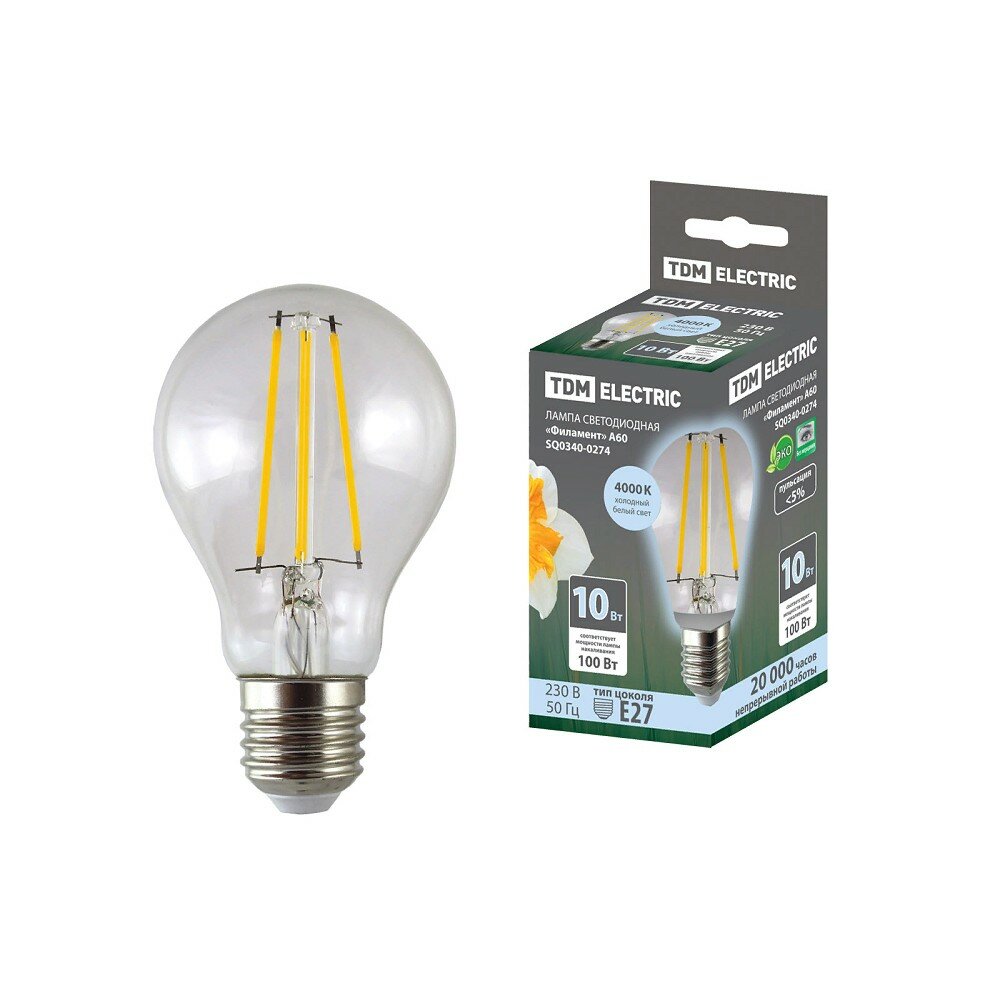 10 цен на TDM SQ0340-0274 Лампа светодиодная "Филамент" А60-10 Вт-230 В-4000 К–Е27