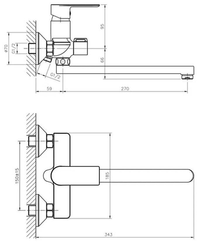 Смеситель на раковину настенный Эверест B46-350 с круглым поворотным изливом, кран-буксы 1/2", хром
