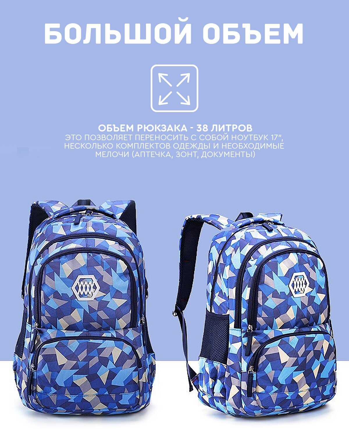 Рюкзак (синий) Just for fun принт "мозайка" 38 литров городской вместительный для детей и взрослых / сумка / ранец информация: