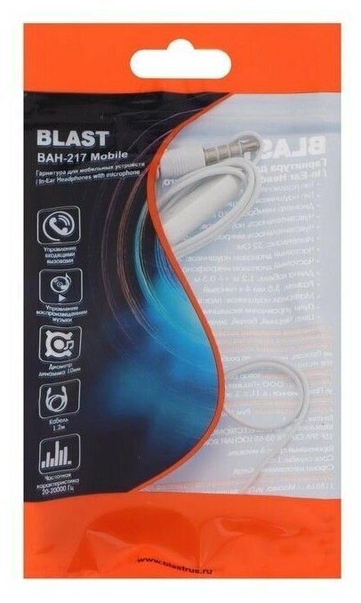 Наушники Blast BAH-217 Mobile, вакуумные, микрофон, 3.5 мм, 1.2 м, белые (2 упаковки) информация: