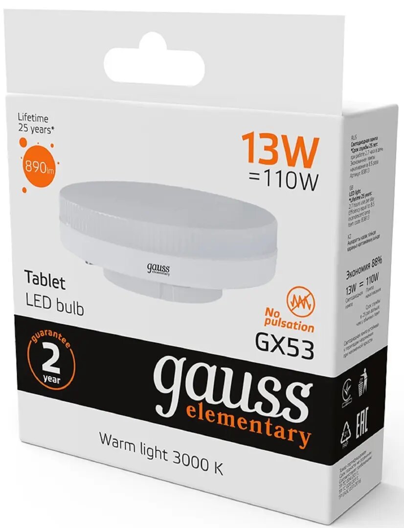 Лампа светодиодная Gauss Elementary GX53 13W 890LM 3000K информация: