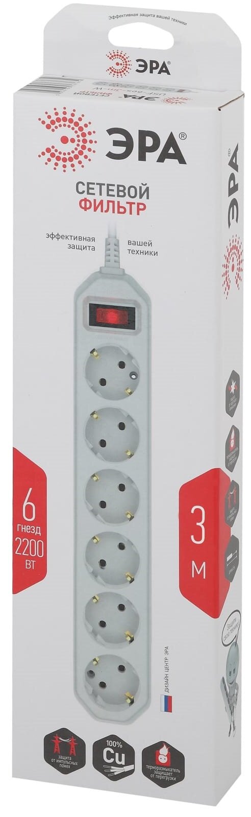 Эра Б0037262 Сетевой фильтр USF-6es-3m-W-BOX базовая защита, с/з, с выкл, 6гн, 3м, ПВС, 10А, белый