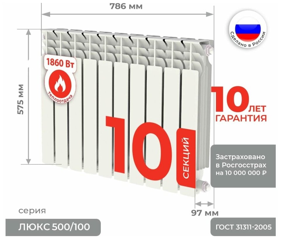 Радиатор Konner LUX 100/200 10 секций боковое подключение алюминий белый