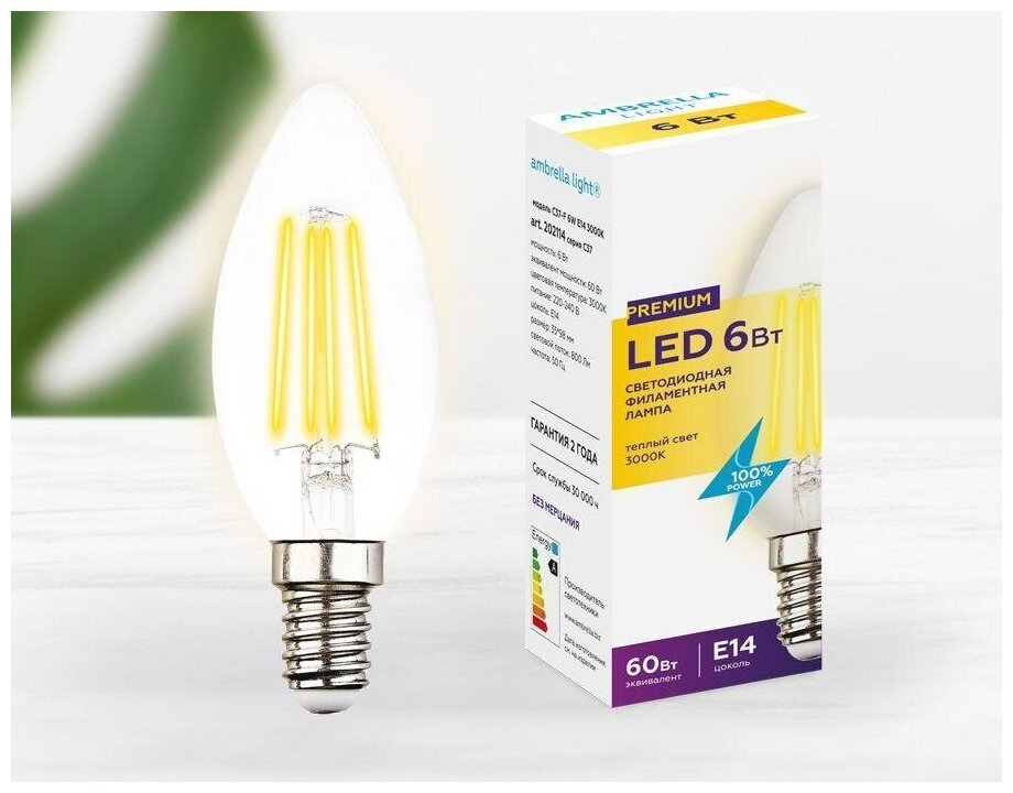 Филаментная светодиодная лампа C37 Лампа Filament LED C37-F 6W E14 3000K (60W) информация: