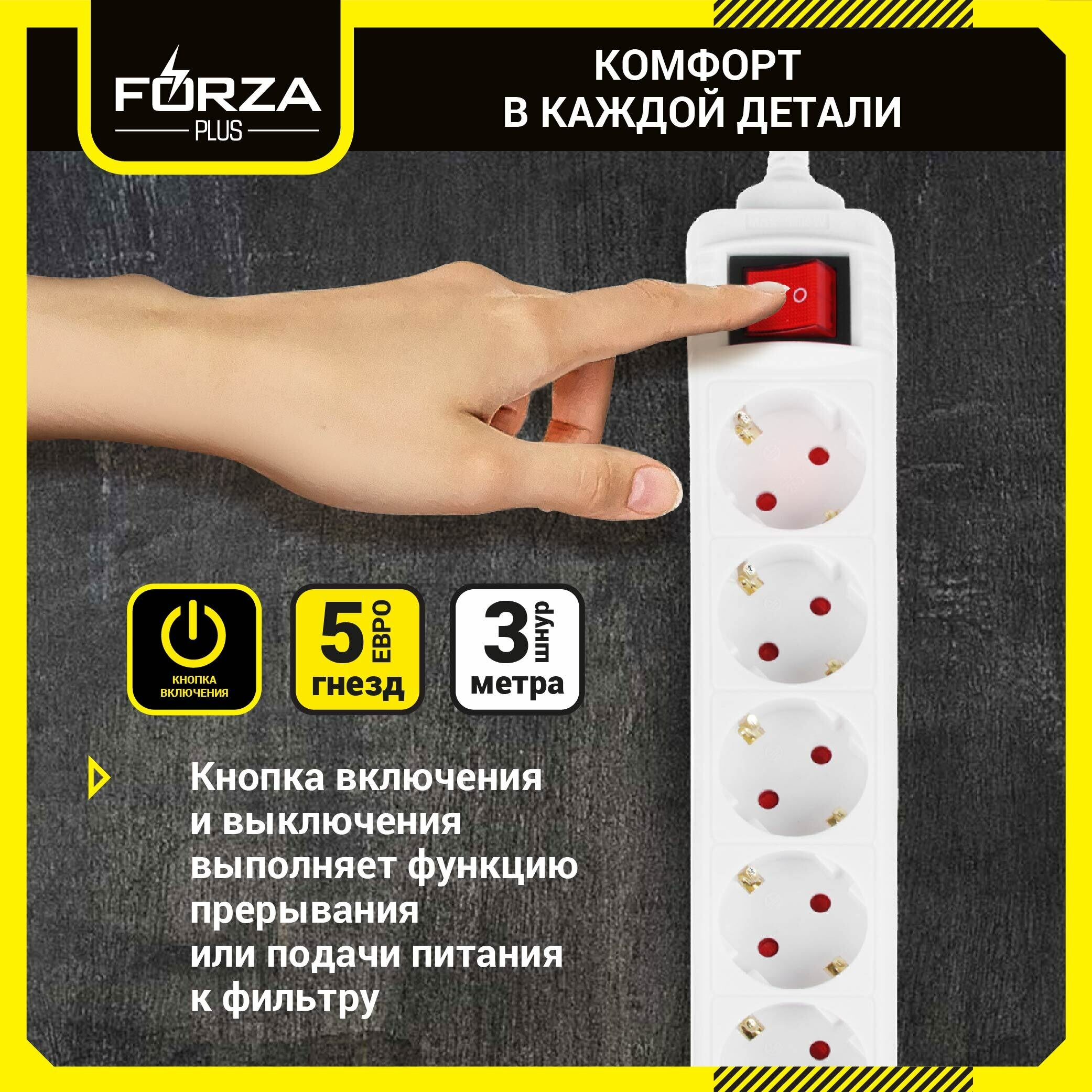 FORZA / Сетевой фильтр, удлинитель 5 гнезд с заземлением, выключателем, евро, 5 м, 16A, 3500ВТ