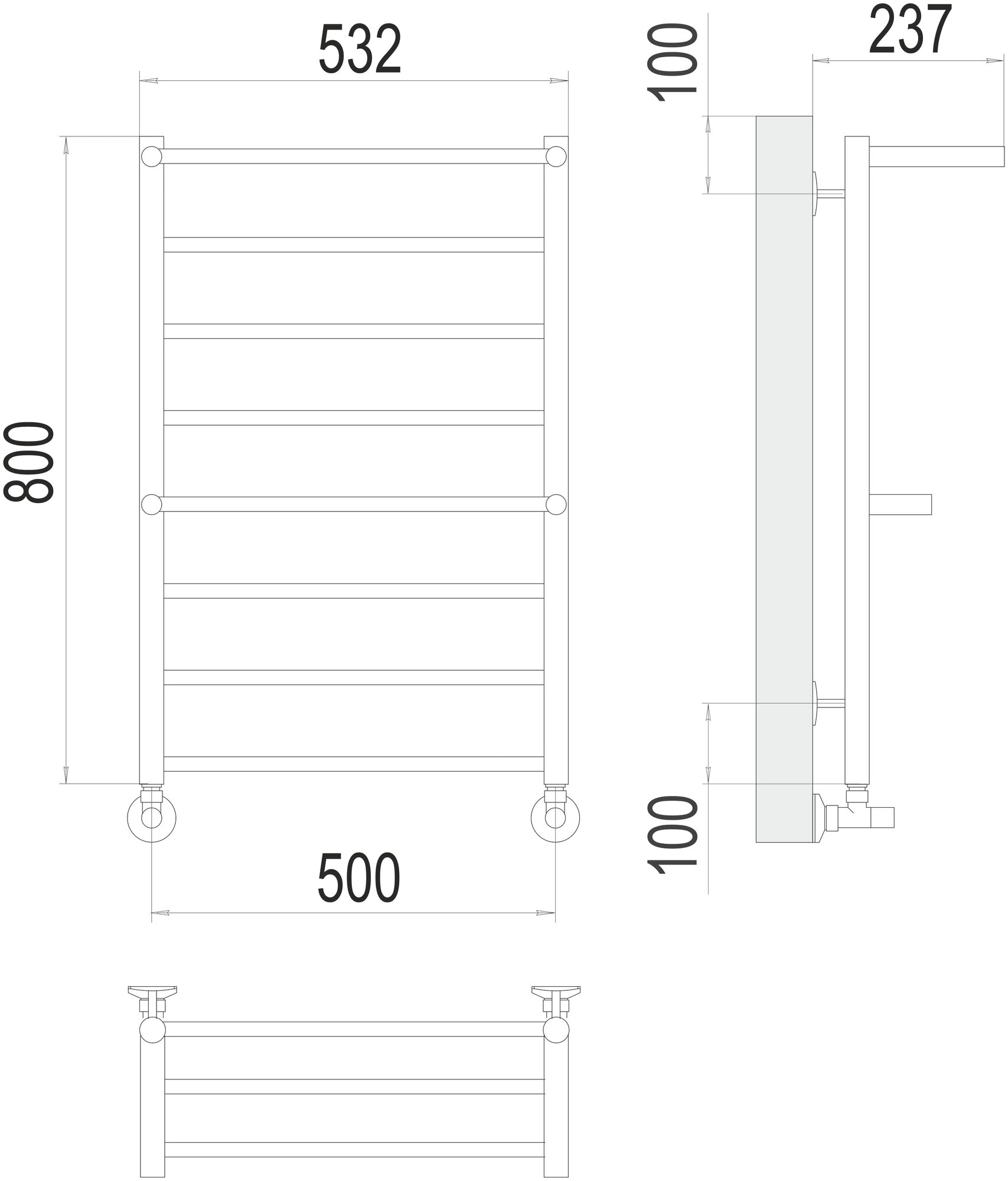 Полотенцесушитель Водяной узкий с полкой Di Kron, модель Premium-T 800х400 боковое подключение 50 см слева угловое