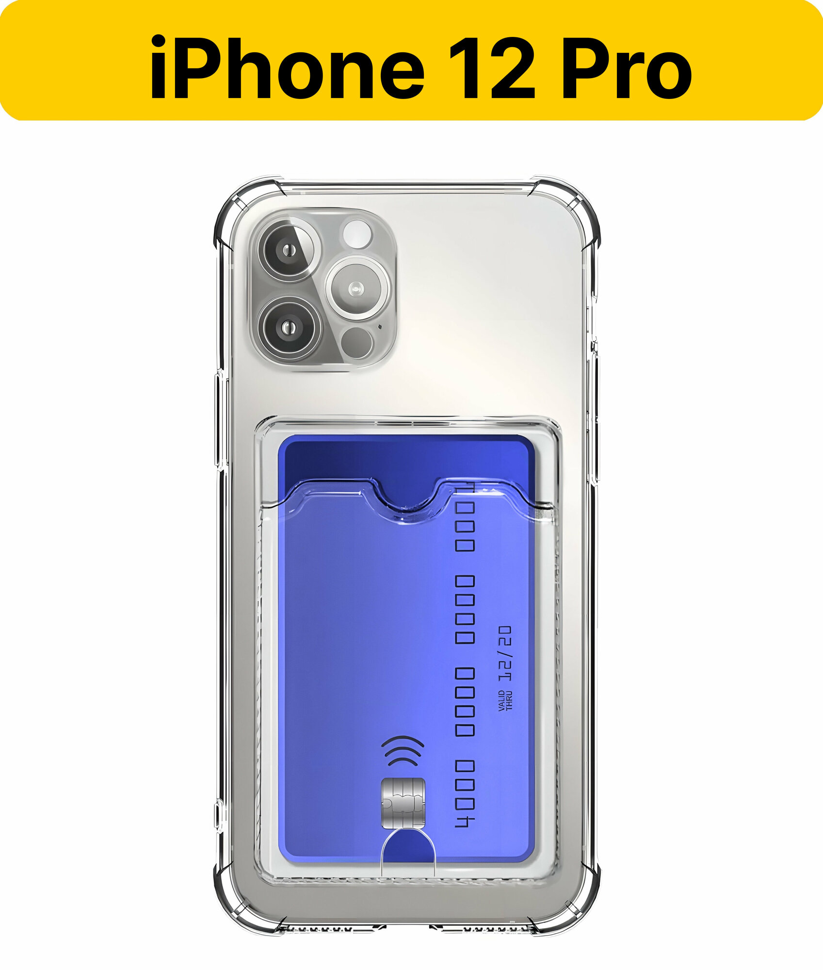 Прозрачный чехол на iPhone 12 Pro c карманом для карт, противоударный с защитой камеры / на айфон 12 про накладка из силикона