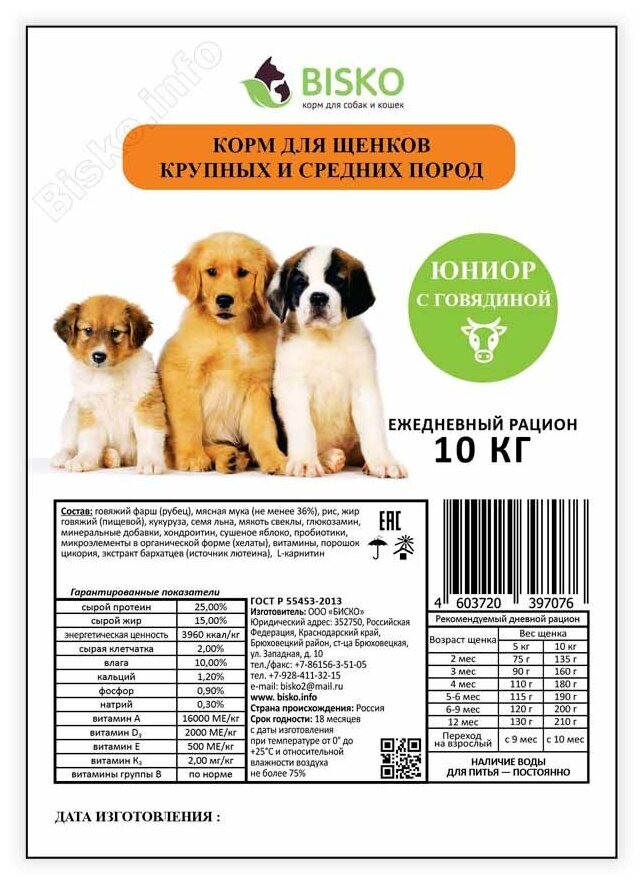 Сухой корм биско/BISKO юниор для щенков крупных и средних пород 15 кг. Промо пакет. информация: