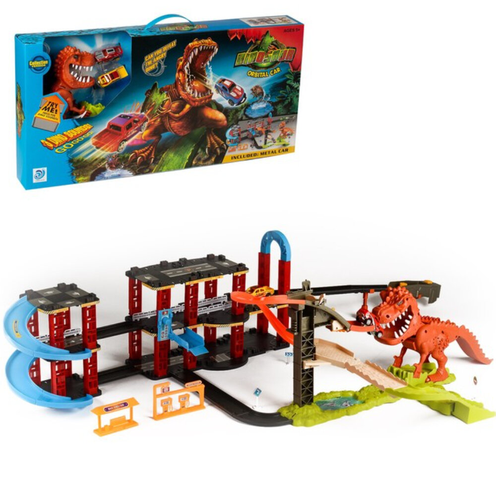 10 цен на Трек Дино с двумя гоночными машинками, аксессуарами, двумя трамплинами и дорожными знаками, 8899-92