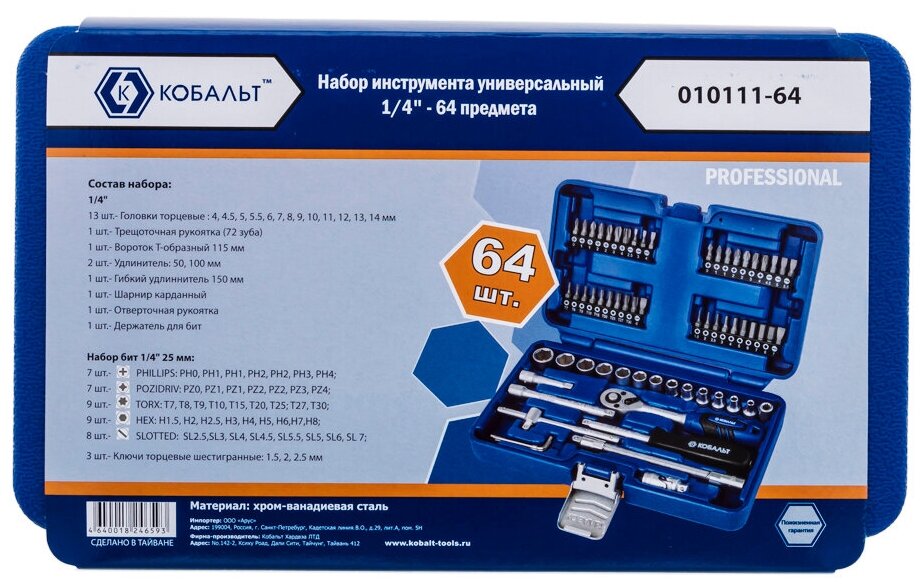 Набор инструментов универсальный кобальт 1/4" (64 предмета) кейс информация: