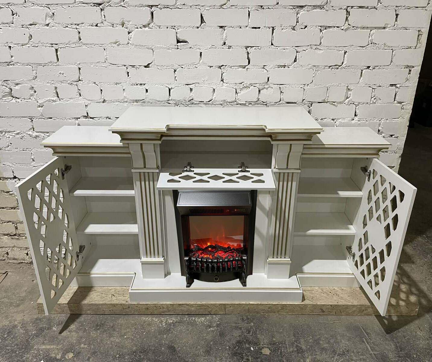 Электрокамин FlameKamin Асгард WT (с патина золото) с очагом Fobos (электрический камин с тумбами и полками)