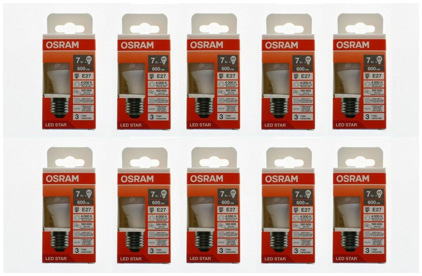 Отзывы на Лампа светодиодная Osram Шар 7W 220V E27 600Лм 2700К теплый белый, упаковка 10шт