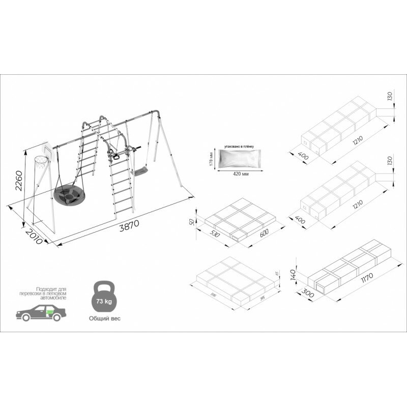 | В комплекте | баскетбольное кольцо, гимнастические кольца, качели, рукоход |