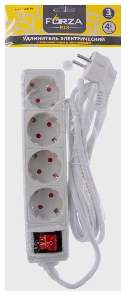 Forza/сетевой фильтр удлинитель электрический 4 гнезда евро розетки, 3 м, с/з, 16А / 3500 Вт