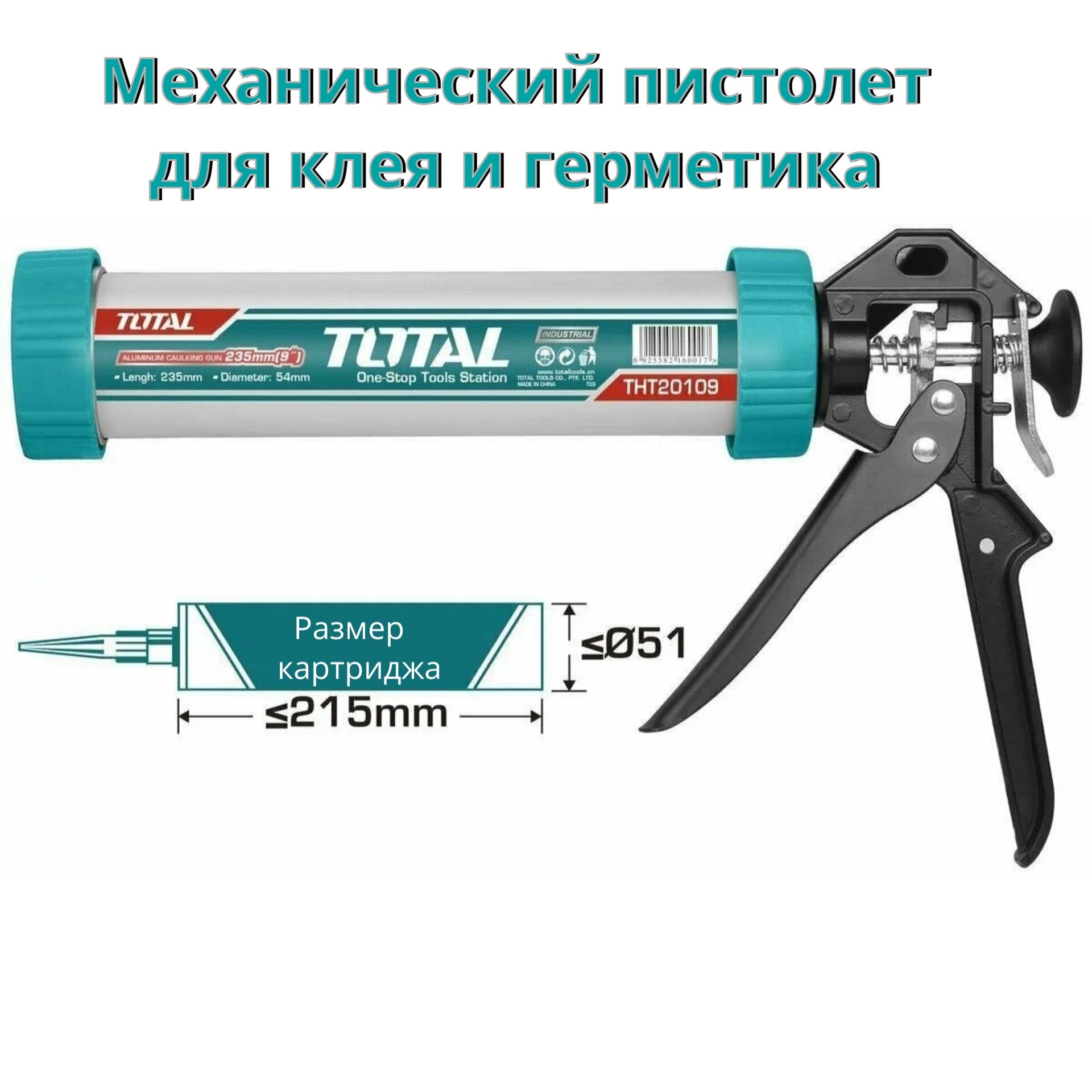 Пистолет для герметика 9" 230мм, железный хвостовик с зубцами, диам: 55мм TOTAL THT21809