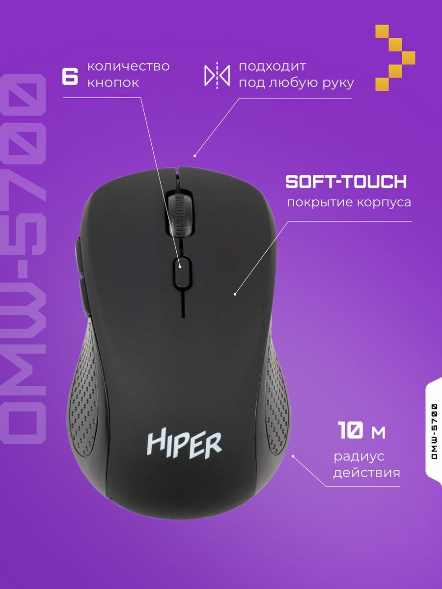 Отзывы на Мышь беспроводная Hiper OMW-5700, 1600 dpi, USB, черный/серый (OMW-5700)