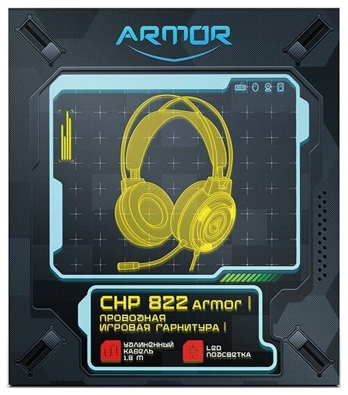 Cbr CHP 822 Armor, Компьютерная гарнитура проводная стерео, игровая, полноразм. наушники, микрофон с шумоподав., USB 2хмини-джек 3,5 мм, LED-подсветка, эргоном. дизайн, длина каб. 1,8 м, цвет чёрный