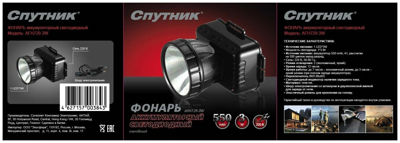 Фонарь налобный светодиодный Cпутник AFH729-3W информация:
