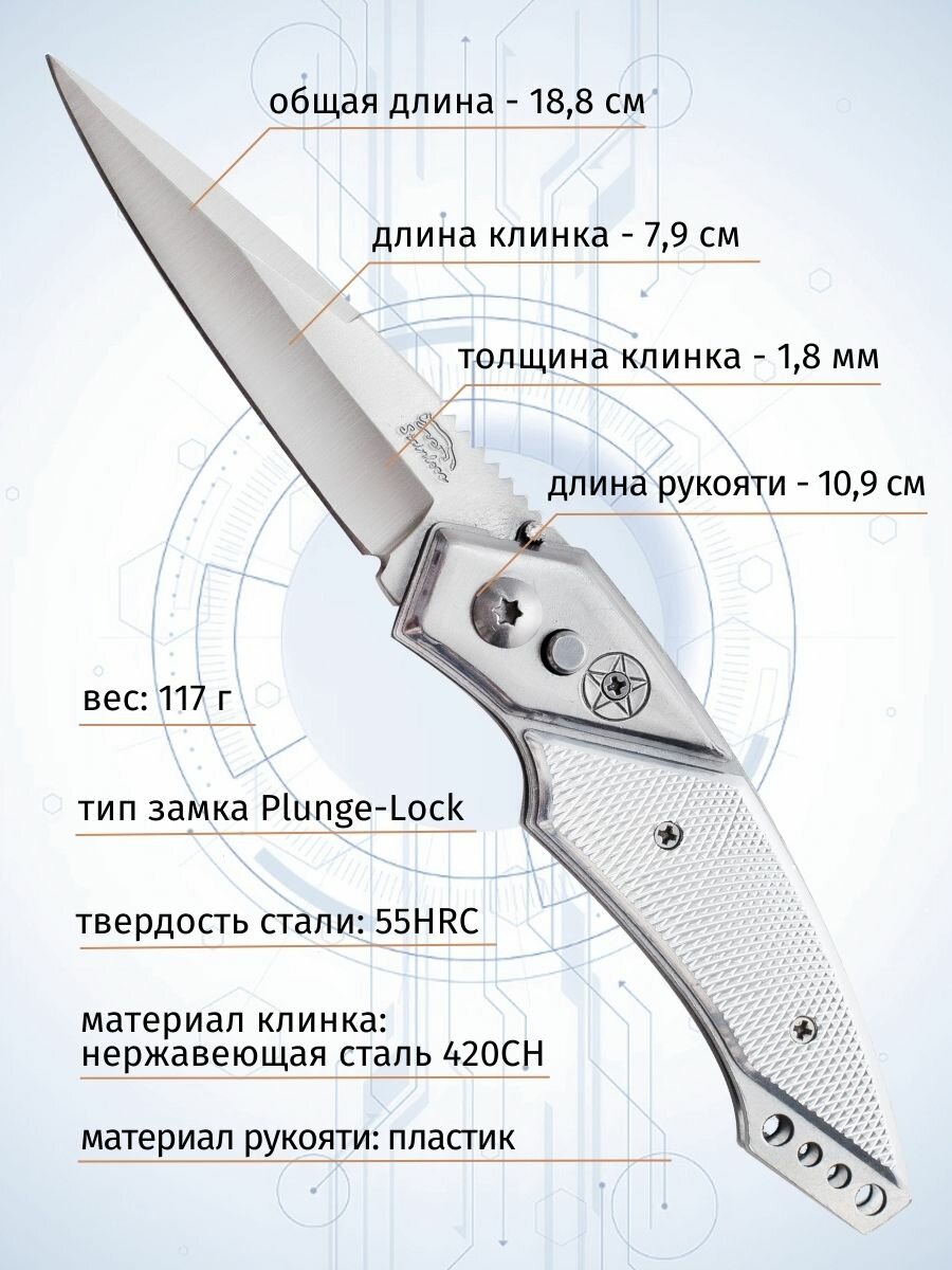 0 отзывов, средняя оценка 0. Чтобы купить «Складной автоматический нож Pirat 3838, пластиковые накладки на рукоять, длина клинка: 7,9 см» по лучшей цене мы сканируем авито, алиэкспресс, маркет, озон, савеловский, плеер, горбушку, беру, официальные сайты и находим минимальную. Администрация не несет ответсвенность актуальность цен на Складной автоматический нож Pirat 3838, пластиковые накладки на рукоять, длина клинка: 7,9 см, более подробно узнавайте на сайте магазина.