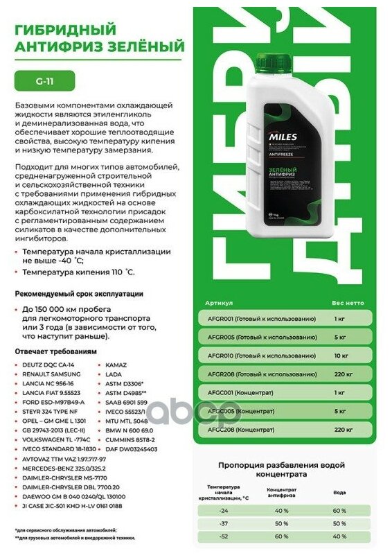 Отзывы на Антифриз Miles G11 зеленый 5кг (SUPER LONG LIFE COOLANT -40C) AFGR005 Antifreeze Hybrid OAT -40C