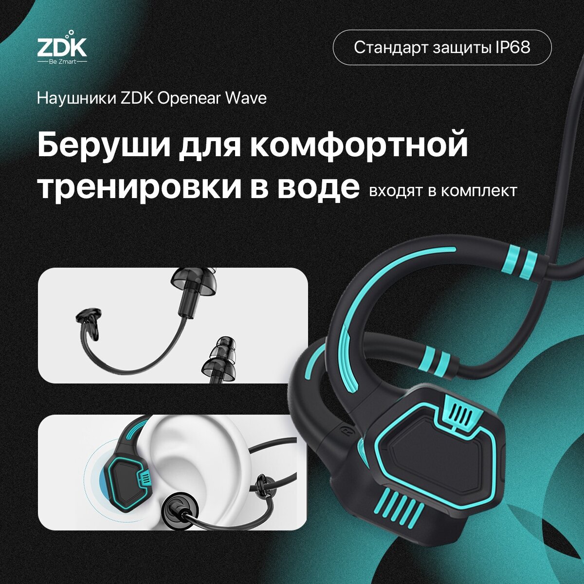 Беспроводные наушники ZDK Openear Wave с костной проводимостью, водонепроницаемые, черный/бирюзовый