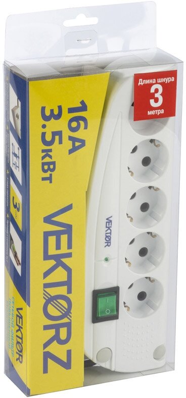 Сетевой фильтр Vektor Z, 3,5 кВт, 16А, 5 розеток (4 с заземлением), 3 м, белый 2 608 ₽