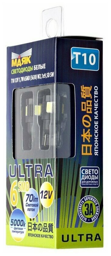 Лампа Светодиодная 12v T10 10w W2,1x9,5d Маяк Ультра 180° White 2 Шт. Блистер 12t10-W/6smd5630/2bl Маяк арт. 12T10-W6SMD56302BL