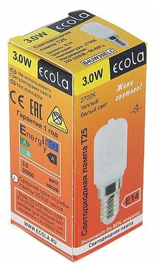 Отзывы на Лампа светодиодная Ecola, T25, 3 Вт, 2700 К, 340°, для холодильников и швейных машин