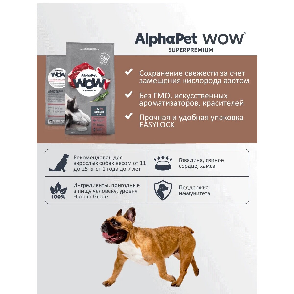 Сухой корм AlphaPet WOW для взрослых собак средних пород с говядиной и сердцем 2 кг информация: