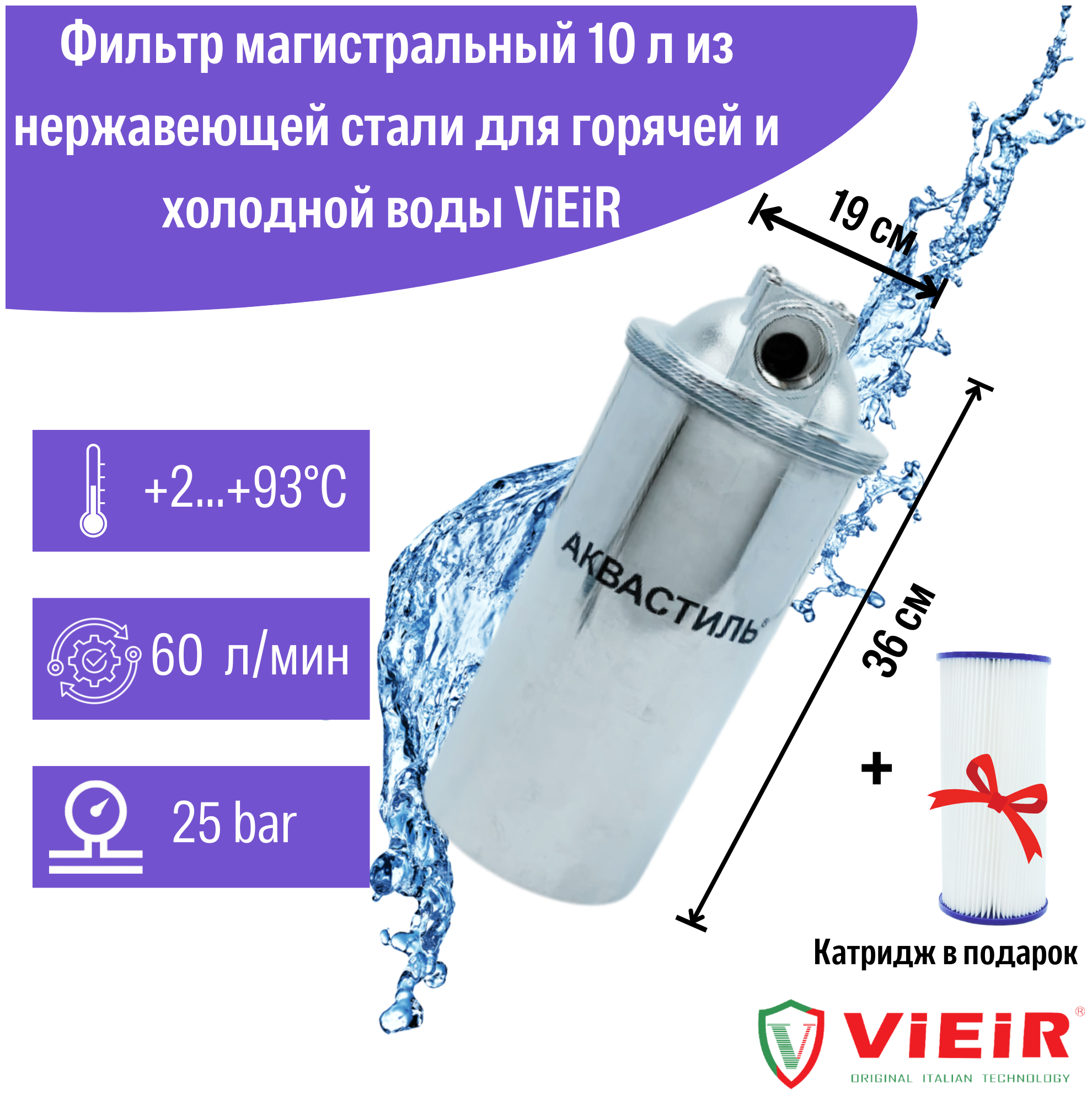 Фильтр магистральный 10 л из нержавеющей стали для горячей и холодной воды ViEiR информация: