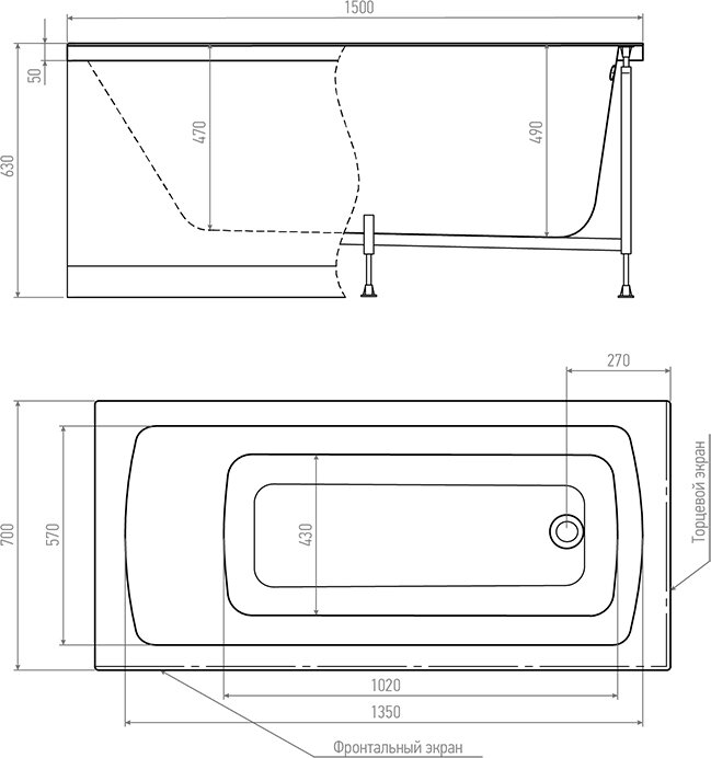 Ванна Gamma 140х70 см, акриловая, на каркасе, экран к ванне Gamma 140