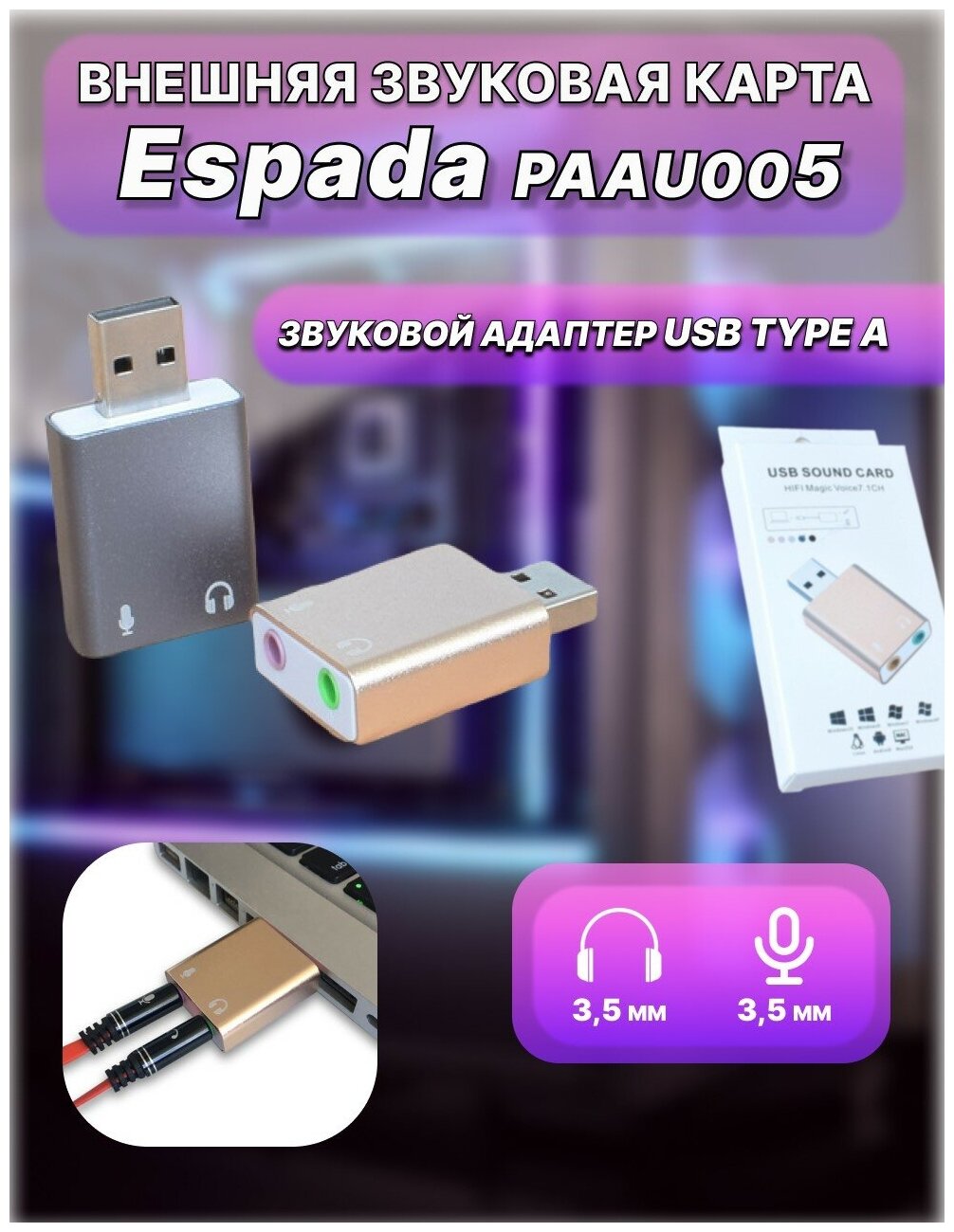 Внешняя звуковая карта Espada Paau005 Usb, модель (для ноутбука/ПК) . информация: