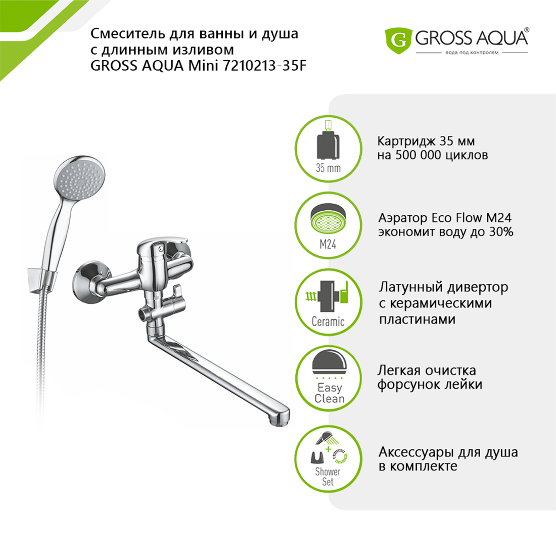 Смеситель GROSS AQUA Mini для ванны и душа с длинным изливом 350 мм 7210213-35F информация: