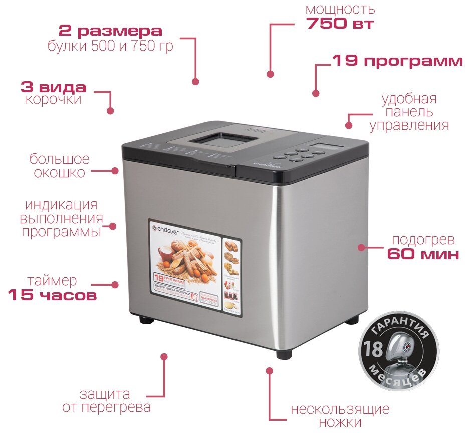 Хлебопечка с замесом теста Endever MB-64 / 20 автоматических программ / выпечка 750/1000/1250/грамм