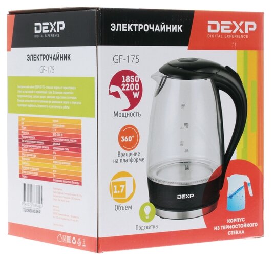 Отзывы на Электрочайник DEXP GF-175 Wave черный [пластик, термостойкое стекло, 1.7 л, 2200 Вт, фильтр, дисковый нагреватель]