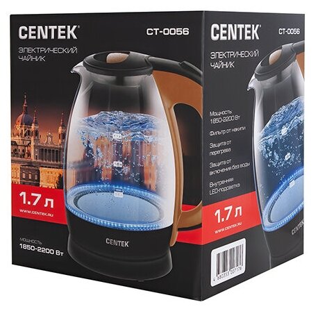 Чайник Centek CT-0056 стекло (бежевый+кофе), 1.7л, 2200Вт, LED-подсветка, боросиликатное стекло информация: