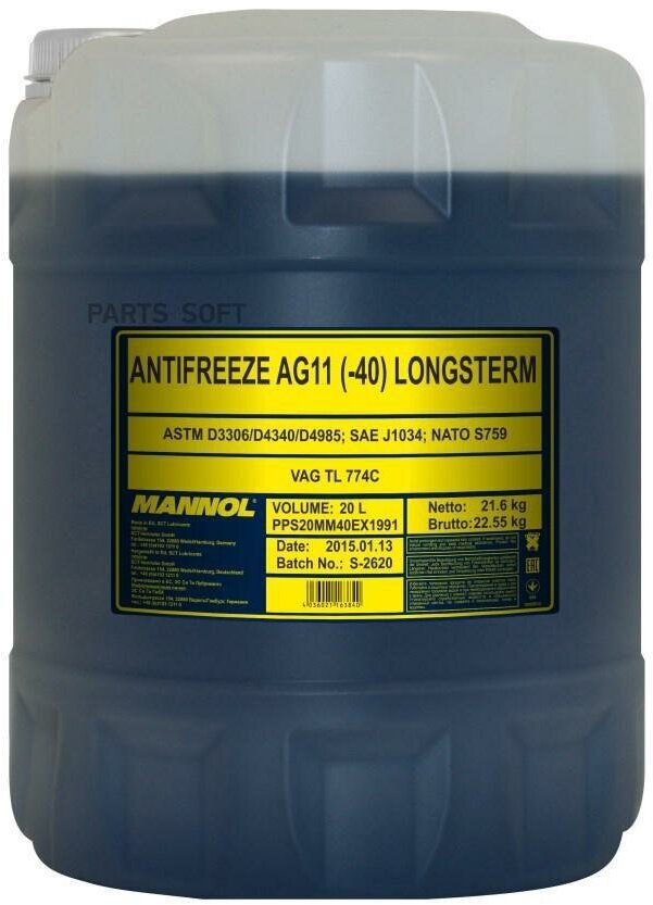 Антифриз antifreeze longterm ag11 (-40 c синий) 20 л., mannol, 2051