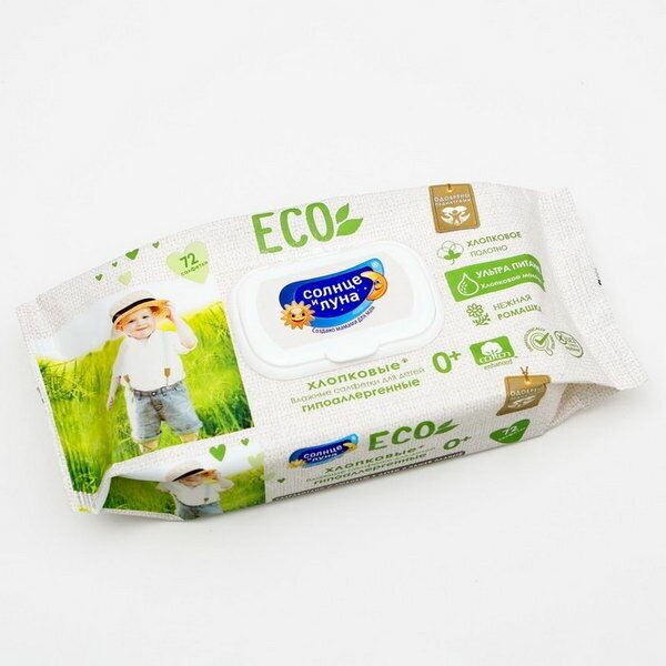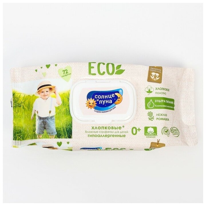 Солнце И луна ECO Влажные салфетки детские 0+ хлопковые нежная ромашка и хлопковое молочко big-pack с крышкой 72шт