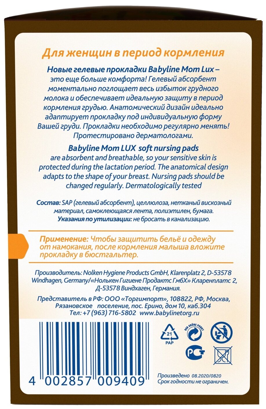 BABYLINE Гелевые прокладки для кормящих мам, Германия, 30 шт.