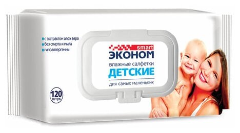Влажные салфетки Эконом smart Детские с экстрактом алоэ вера, пластиковая крышка, 120 шт., 1 уп.